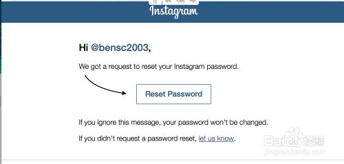 6、接下来就去打开注册 Instagram 的邮箱,找到重置密码的邮件,并点击邮箱内容中的 Reset Password 链接,如图所示