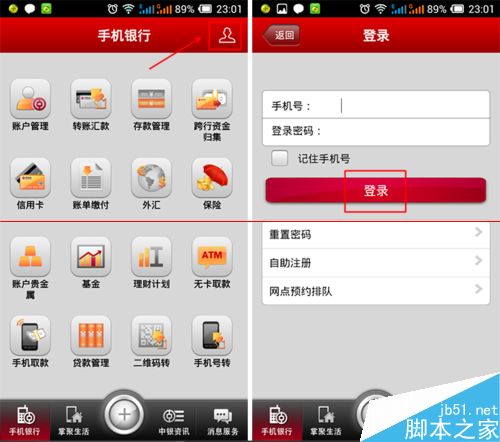 2、安装完成之后,打开中国银行手机客户端,在主界面先点击【登录】按钮,输入自己的【用户名+登录密码】进行登录。