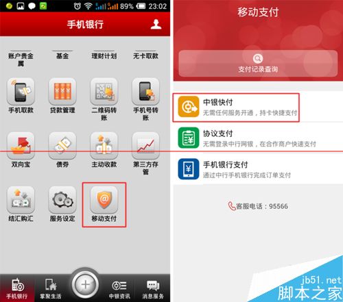 3、进入手机银行后先点击【移动支付】然后选择【中银快付】