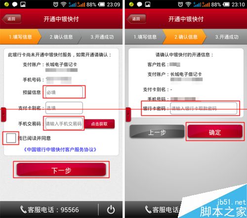 首先是填写【预留信息】接着点击获取交易码之后输入【交易码】随后【勾选协议】点击下一步,此时在输入【银行卡密码】点击确定。