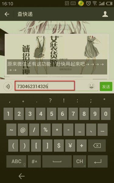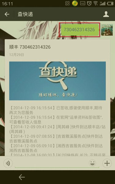 要查快递的时候,进入公众号的聊天信息界面,直接输入你的快递单号,如果是不常用的快递公司单号,可以输“快递公司+单号”。