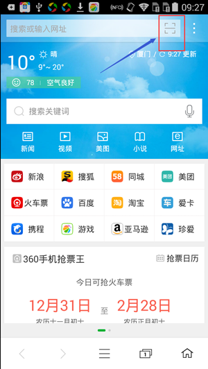 2、360手机浏览器的二维码在搜索框右边,可看到二维码图标,点击进入,如下图所示: