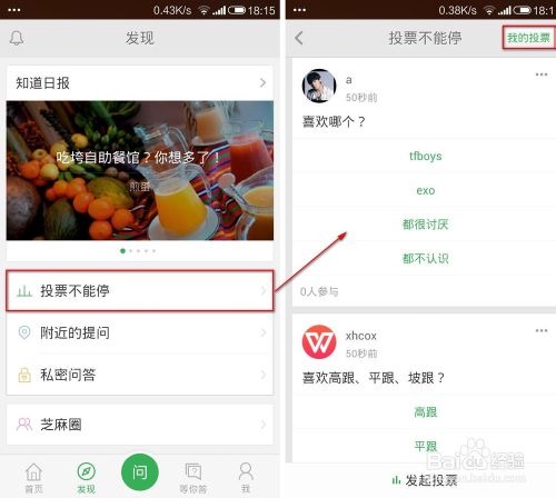 3、投票。这时候我们点我们菜单栏“问”左边的“发现”>"投票不能停",这是网友发布的投票,你可以去给别人投票,当然你自己也是可以发起投票的,单机左上角的“我要投票”,就可以发布内容让别人投票了。