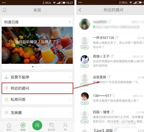 4、附近的提问。进入之后你可以查看附近人的提问,点开之后可以回答别人的问题,当然,你也是可以进行提问,让附近的人来回答你。