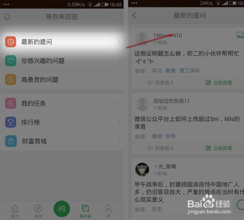 7、最新提问。点开菜单栏“问”右边菜单栏中“等你答”,里面有“最新的提问”,在这里,就是网哟最新提的问题,可以在这里回答,这就是 为什么这么快就收到回答的原因了。
