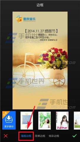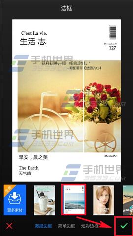 3)进入界面点击【海报边框】,在素材框选择海报边框点击一下,然后点击【√】。(如下图)