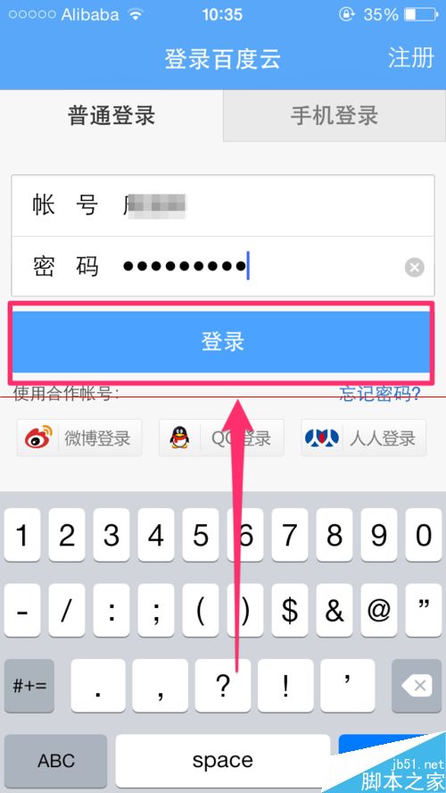 2、在界面录入框中输入自己的百度账号和密码,找到界面下方的“登录”按钮,点击进入下一步。