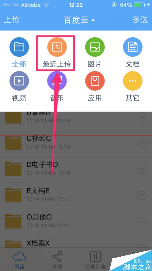 4、从页面顶端弹出一个下拉菜单,找到菜单中的“最近上传”按钮,并点击进入下一步。