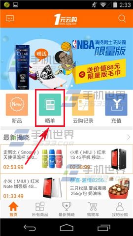 1)首先打开1元云购,在首页点击【晒单】。(如下图)