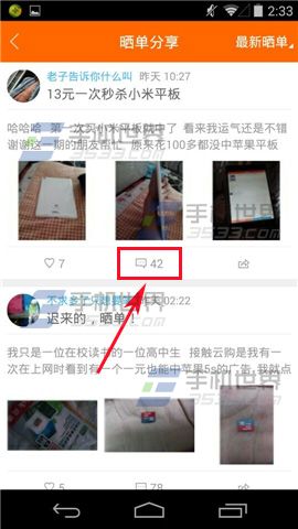 2)进入界面选择要评论的晒单点击【消息图像】,进入界面在方框输入文字,点击【发送】即可发布评论。(如下图)
