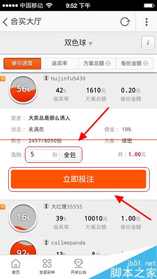 5、购买前 —— 先查看发起人的选号方案 —— 有些方案是隐藏起来的 —— 看清楚后 —— 再输入购买份数 —— 然后点击立即投注 。