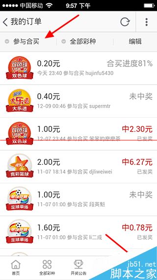 8、在我的订单这里 —— 点击参与合买的彩票 —— 如果中奖了也可以在这里看到。