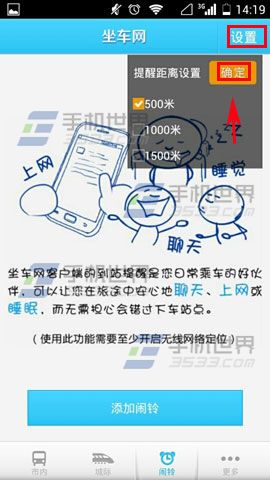 1)首先先打开坐车网,进去之后点击【闹铃】,接着点击右上角的【设置】,弹出提示后选择自己想要的距离点击【确定】就可以了。(如下图)