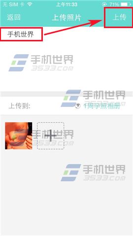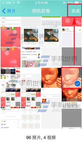 4)在界面选择照片点击一下,然后在右上方点击【完成】,在界面还可以输入文字,最后点击【上传】即可。(如下图)