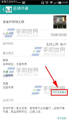 2)点击【店铺的名称】进入到店铺详情,点击餐台情况一栏右下角的【显示全部餐台】就可以看到这个店铺的所有餐台啦。(如下图)
