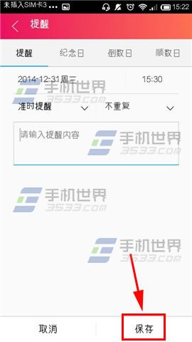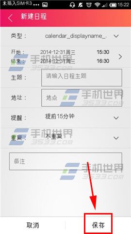 2)这里有三种类型的提醒,先来看看【第一个】,点击进入第一个图标,这里可以新建日程,可以设置开始跟结束的时间(例如出差跟出游),编辑好内容后记得点击【保存】。(如下图)