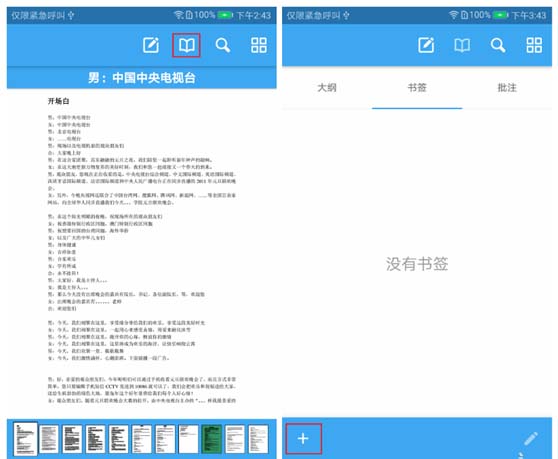 在书签界面,单击界面左下角的“+”即可将当前文档界面添加为书签。