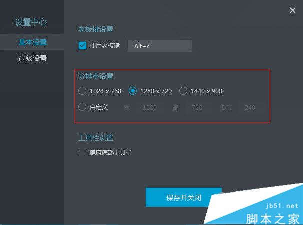 2、打开【设置中心】,选择【分辨率设置】,点击【保存并关闭】