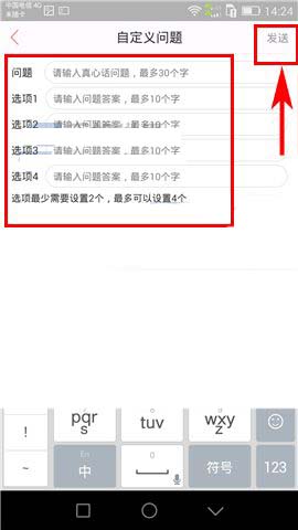 4)最后再在编辑好问题与答案选项后点击右上方的【发送】即可。(如下图)