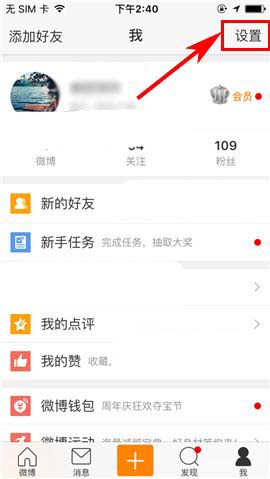 1)打开手机新浪微博,首先点击首页右下角处的【我】,然后进入【设置】;(如下图)