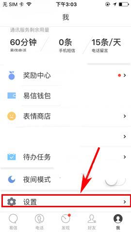 1)打开易信APP,首先点击首页中右下方的【我】,随后上滑界面进入【设置】;(如下图)