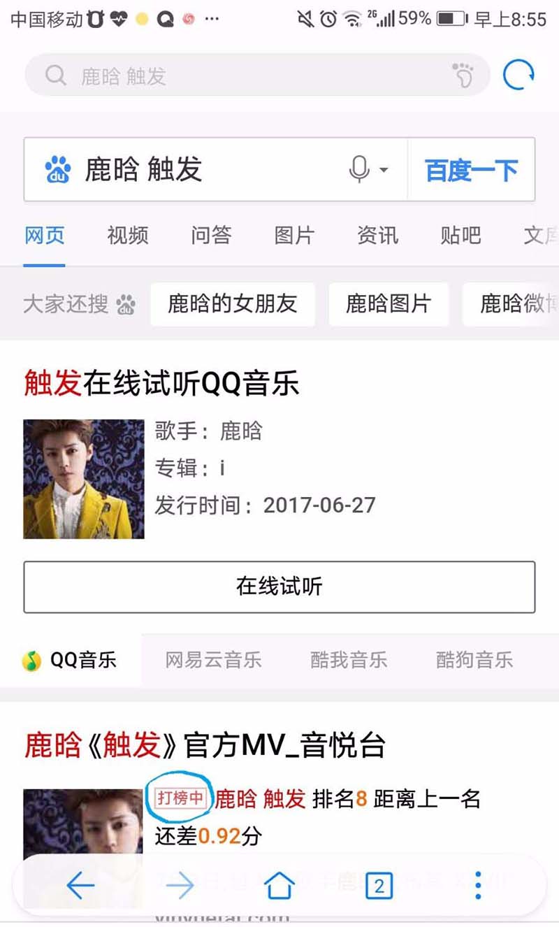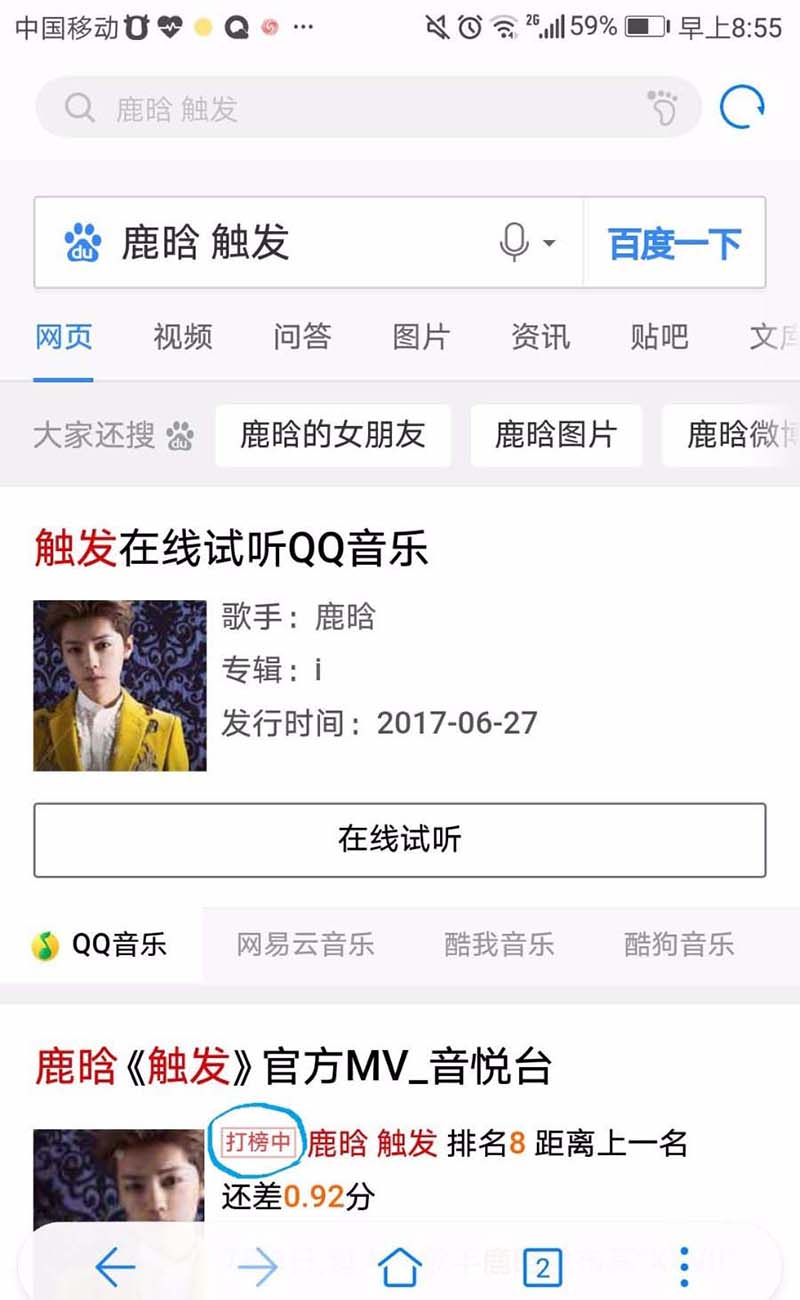 1、在手机上用百度搜索你要打榜的歌手+歌曲名