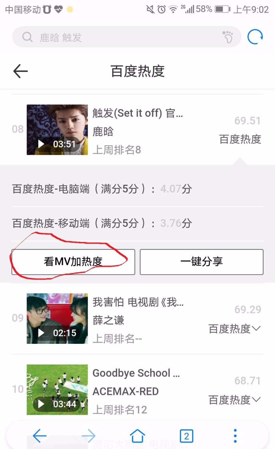 3、找到要打榜的mv,点击视频或点击“看mv加热度”