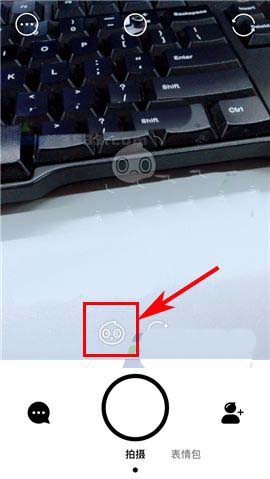1)点开Faceu激萌APP,首先点击拍摄界面中箭头所指处的【贴纸】图标,随后在“HOT”栏目中找到屏幕中所示的“双人换脸”选项;(如下图)