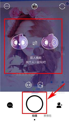 2)接着将手机中的拍摄框对准自己和好友,点开下方的“拍摄”按钮即可进行拍照或录制双人换脸视频啦~(如下图)