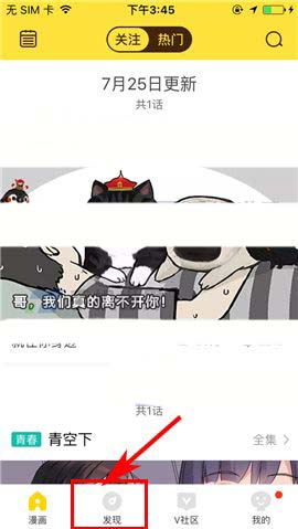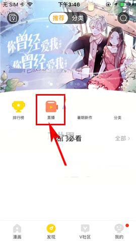 1)点开快看漫画APP,首先点击首页下栏中的【发现】,然后点击【直播】;(如下图)
