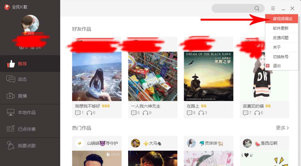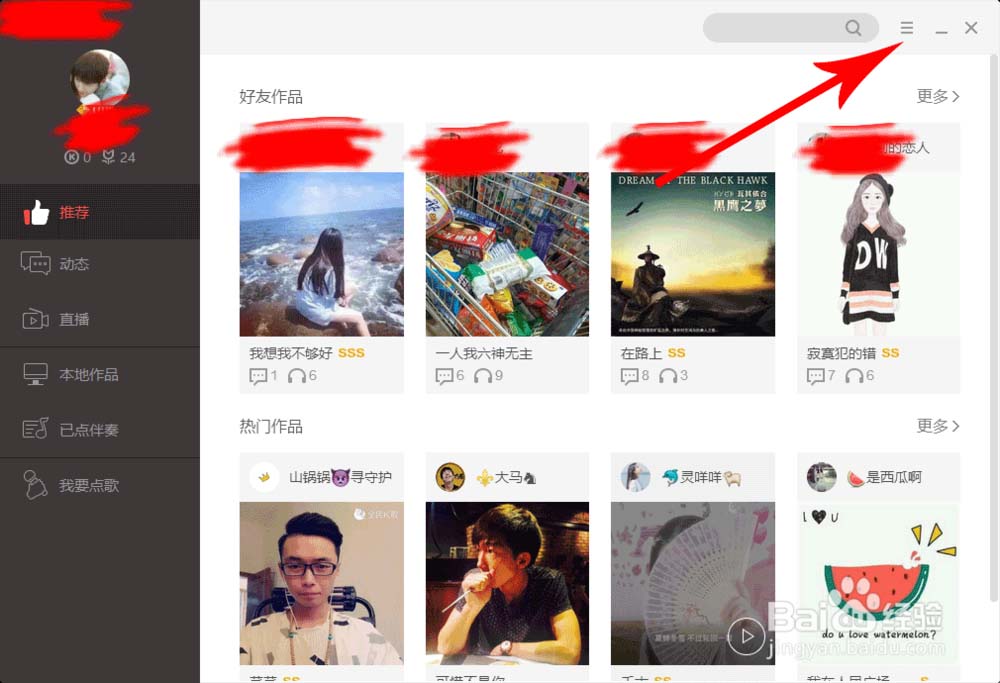 1、打开电脑版的全民K歌,看到这个主页,点击右上角的三条杠