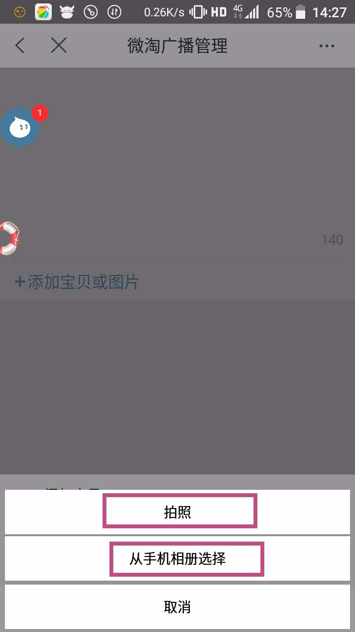 4、接下来点击“添加图片”,选择微淘要发的九宫格图片。这时也可以现场拍照上传。图片要先存在手机里哦。