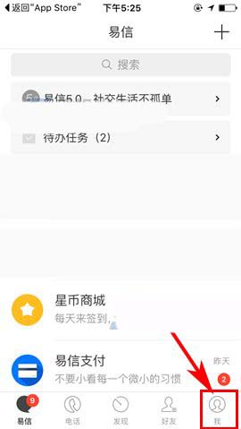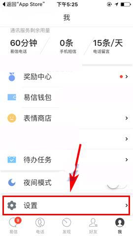 1)点开易信APP,首先点击首页右下角处的【我】,随后上划界面进入【设置】;(如下图)