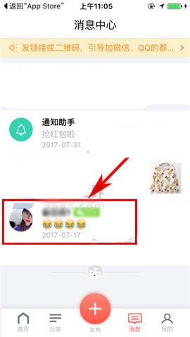 1)点开转转APP,首先点击首页下栏中的“消息”,然后选择相关的聊天会话框(当然我们可点击“我的”界面选择相关的粉丝或关注的用户);(如下图)