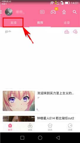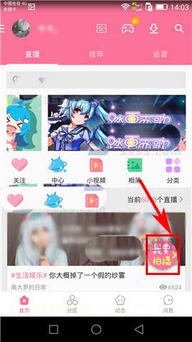 1)点开哔哩哔哩动画APP,首先选择首页界面中的【直播】一栏,接着点击【我要拍摄】按钮;(如下图)
