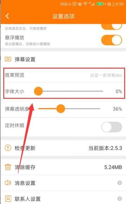 3、接着来到了设置页面,我们看到下方的弹幕设置,下方有字体大小和弹幕透明度设置,如图所示。
