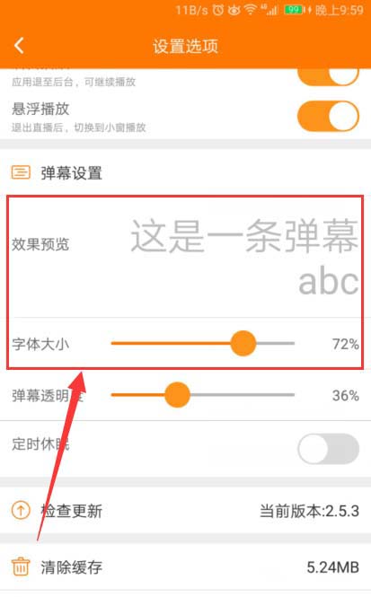 4、我们加入要调节弹幕字体大小,我们只需要把字体大小上的黄圆圈往右边移动就可以了,如图所示。