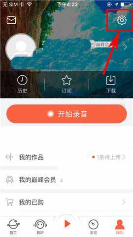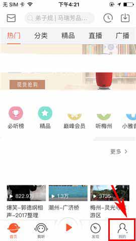 1)点开喜马拉雅FM,首先点击首页右下角处的【我的】,然后再点击界面中的【设置】图标;(如下图)