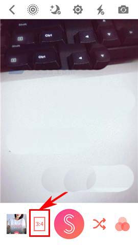 1)点开潮自拍APP,首先点击首页中的【拍摄】按钮,然后点击界面中箭头所指处的“图片比例”图标;(如下图)