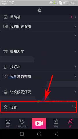1)打开美拍APP,首先点击首页右下角处的【我】,然后上划界面进入【设置】;(如下图)