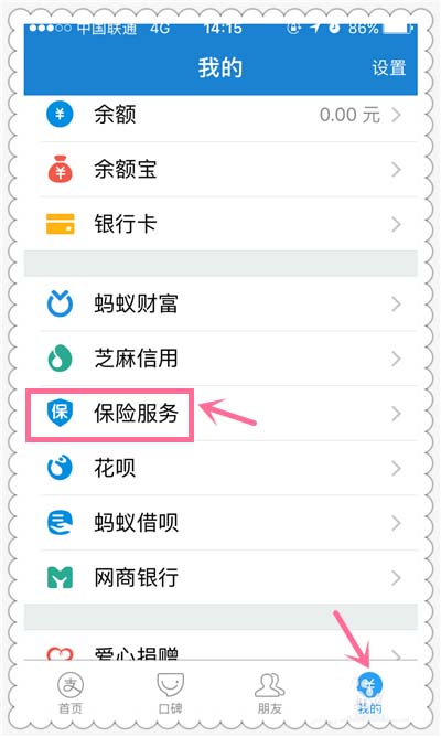 3、那么如果我们想要从支付宝钱包里边找到入口,应该怎么办呢?在支付宝钱包“我的”界面,就可以看到“保险服务”选项,点击进入。