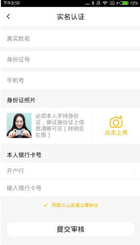 3、最后用户填写真实姓名、身份证信息、上传手持身份证照片等,提交审核,等待审核通过后就可以直接进行直播了;