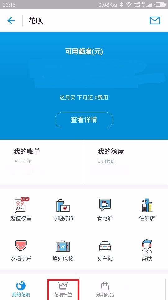 2、找到“花呗”,在花呗页面点击“花呗权益”
