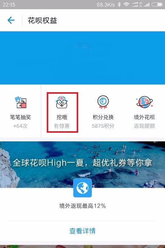 3、点开“花呗权益”,之后可以看见“挖哦”