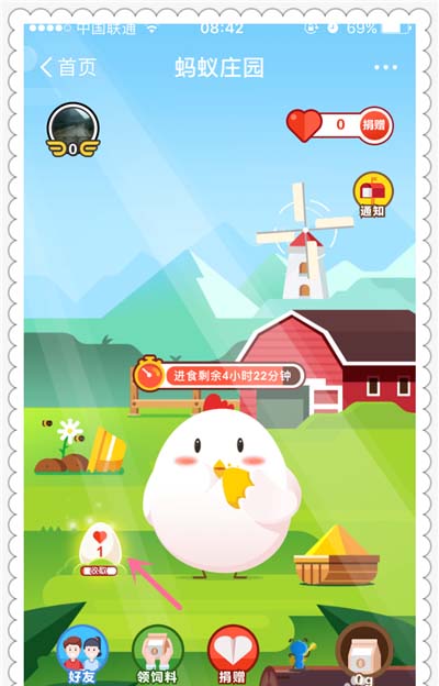 5、经历了漫长的等待时间以后,就可以看到我们可以收取鸡蛋了,点击就可以收取了,收取之后,可以在右上角看到。