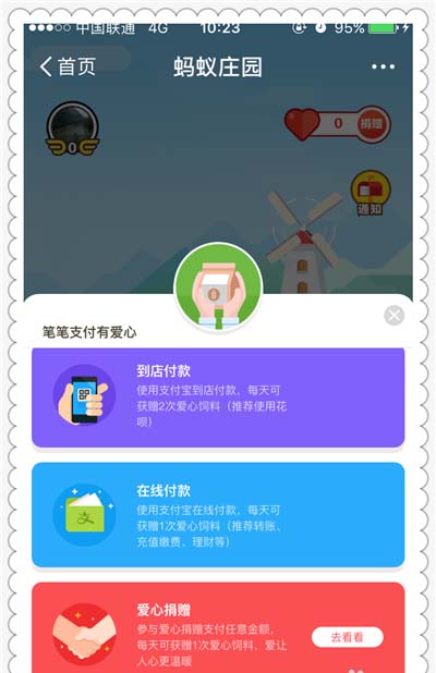 3、总的来说获取饲料的方法很简单,那就是通过支付宝钱包来花钱,线上或者线下都是可以的。