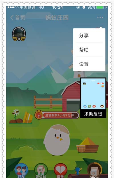 4、大家如果对于这个蚂蚁庄园领取饲料方面有任何疑问的话,都是可以点击右上角的三个点组成的图标。