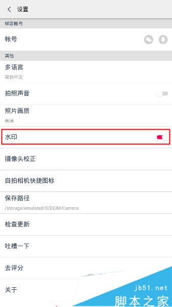 2、在“设置”界面中,把“水印”一栏的开关打开即可。