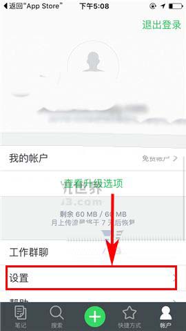 1)点开印象笔记APP,首先点击首页右下角处的【账户】,然后进入【设置】;(如下图)