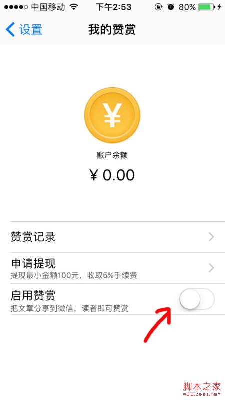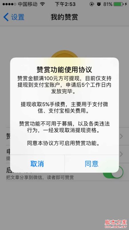 3.点击“启用赞赏”会跳出提示,点同意,成功开启后按钮显示为绿色;